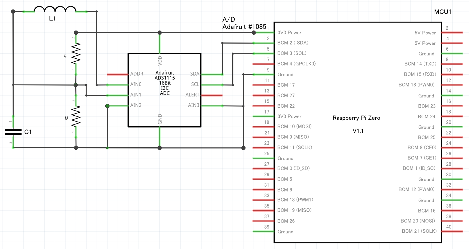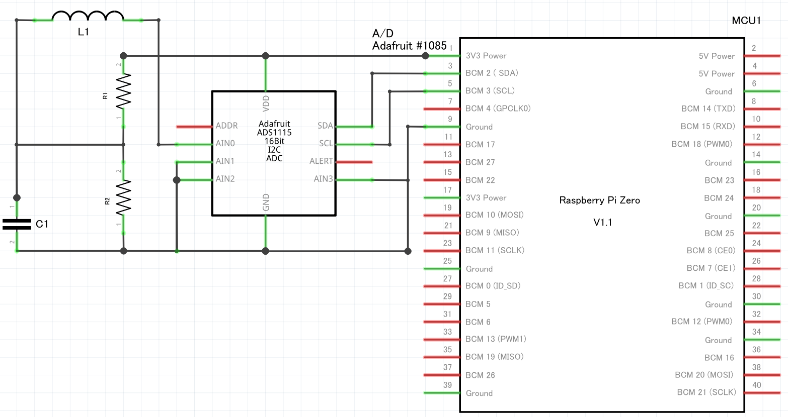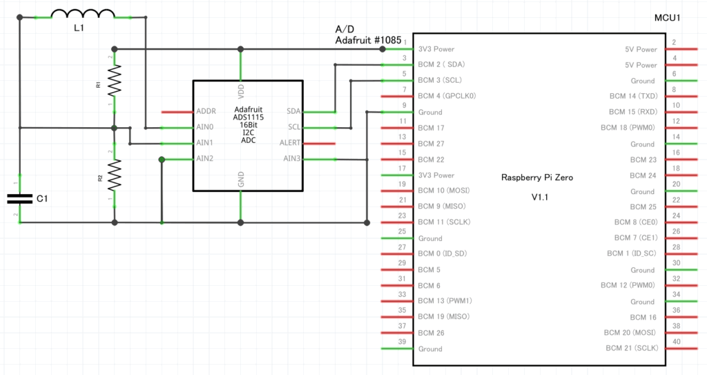 ADS1115とRaspberry PiのI2C接続に加え、SCT-013-030の信号をADCで扱えるようにするための回路(信号調整回路)を組み込みます。